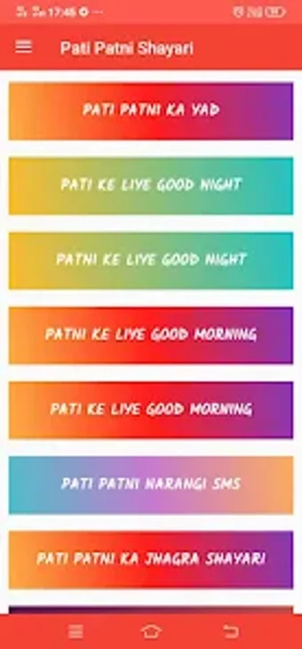De app bevat een verscheidenheid aan Shayari die speciaal is samengesteld om de unieke band tussen echtgenoten te vieren. Of je nu je liefde wilt uiten, een diepgaand gevoel wilt delen of gewoon een status wilt plaatsen, Pati Patni Shayari biedt de juiste woorden. De veelzijdigheid van de teksten maakt het een waardevolle bron voor iedereen die op zoek is naar inspiratie in hun relatie.
